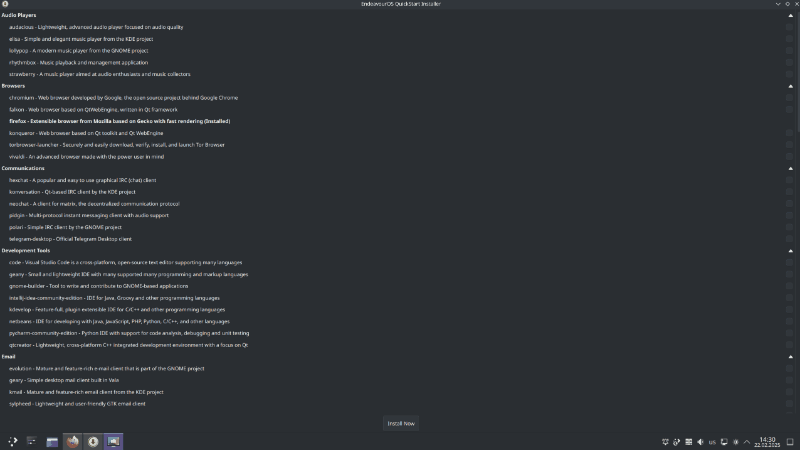 # Так как этот дистрибутив основан на Arch’е и старается быть максимально с ним совместимым, в нем нет центра приложений Discover(даже если его как то установить, то в нем возможно лишь найти программы из Flathub, при условии что он установлен тоже). А также нет менеджера пакетов Pacmac(но по инструкции из сети, можно установить его и он даст удобный интерфейс для взаимодействия с пакетами, к тому же откроет удобный доступ к программам из хранилища AUR).